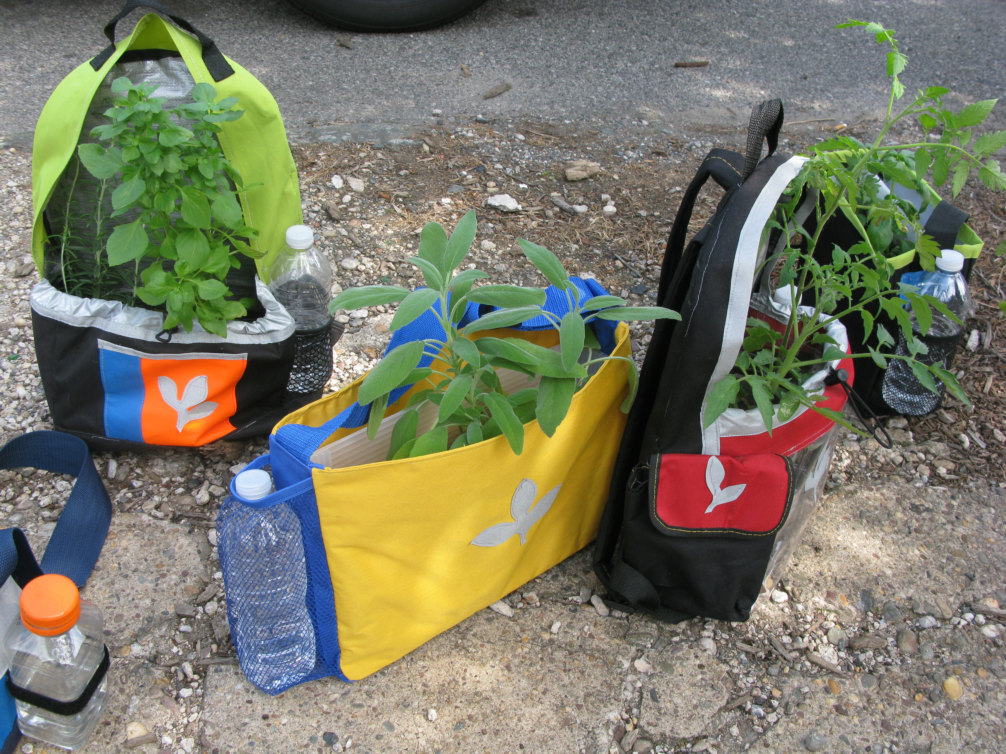 Some kids-sized shoulder plant bags made with the Glen Raven donated fabric. The emblem of the Germination Corps., the three leafed sprout, is a necessary component of each bag and is a quick identifier of the project.